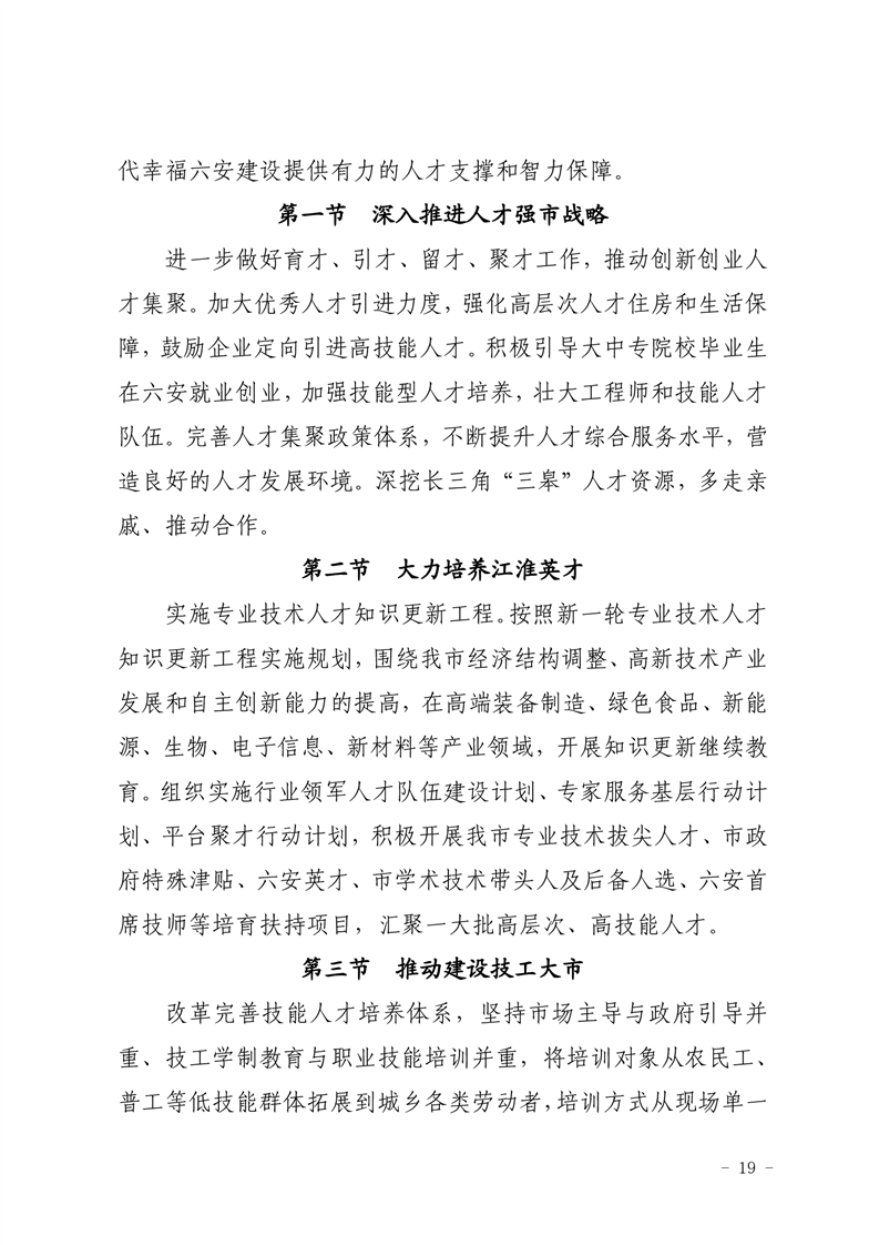 第五章为“推进人才人事队伍建设”。坚持党管人才原则,牢固确立人才引领发展的战略地位,深入实施人才强市战略,统筹推进各类人才队伍建设,为加快新时代幸福六安建设提供有力的人才支撑和智力保障。主要包括深入推进人才强市战略、大力培养江淮英才、推动建设技工大市、推进事业单位人事制度改革和健全表彰奖励机制等五个方面内容。