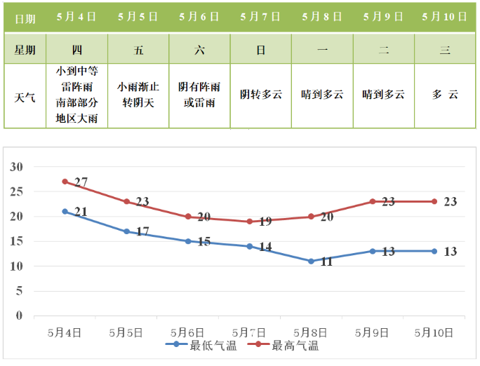 今天我市小到中等阵雨或雷雨,南部部分地区大雨;明天小雨渐止转阴天;后天阴有阵雨或雷雨;7日起转为多云天气。未来一周全市气温先降后升,6-8日受北方弱冷空气影响,最高气温降至20℃左右,最低气温11~15℃;9日起气温缓慢回升,最高气温升至23℃左右。具体预报如下: