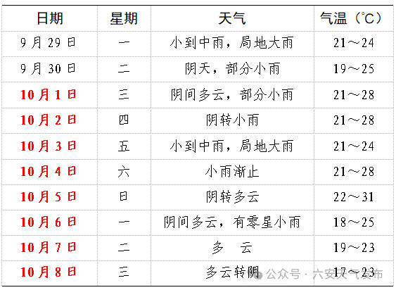 10月4日前我市多阴雨天气,其中今日和3日降水较明显,部分地区大雨;假日中后期全市以多云天气为主。