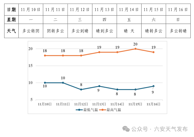 本周我市以晴到多云天气为主,其中今明两天云系较多。本周气温波动不大,最低气温8~10℃,最高气温19℃左右。近期近地面湿度较大,部分路段早晚能见度较低,出行请注意交通安全。具体预报如下: