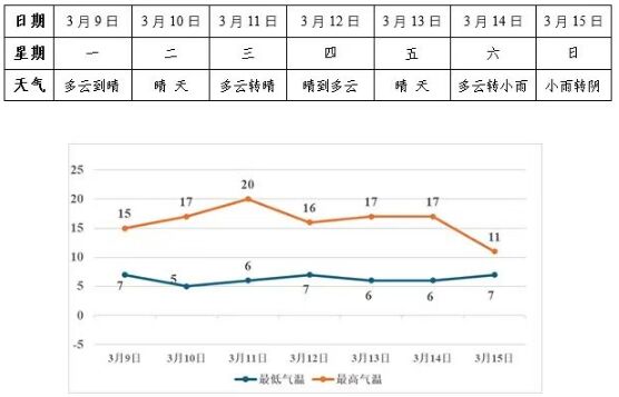 本周我市以多云到晴天气为主,周末有一次弱降水过程,全市小雨。本周前期气温逐渐上升,11日最高气温升至20℃,最低气温5~7℃;受弱冷空气影响,12日起气温略有下降,最高气温降至16℃左右;周日还有一次降温过程。