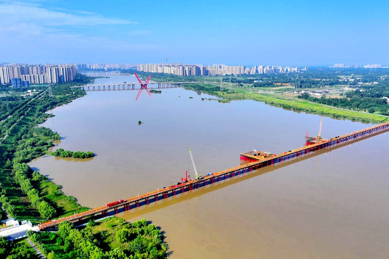 7月3日,在位于金安区城北镇境内的合武高铁六安淠河特大桥栈桥(金裕淠河特大桥)施工现场,工人在已经合龙的施工便桥上进行钢管焊接,为下一步河道内主桥桩基施工运送物资及大型设备做准备。