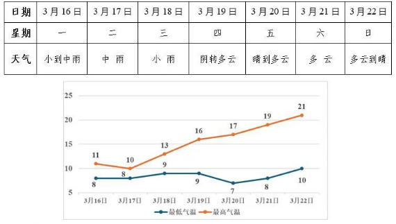 未来三天全市持续阴雨天气,其中今明两天降水较明显,部分地区中雨;19日起逐渐转为多云到晴天气。受降水影响,本周前期温度较低,气温维持在10℃左右,降水期间近地面湿度较大,部分路段能见度较低,出行请注意交通安全;19日起气温逐渐回升,周末最高气温将升至20℃以上。