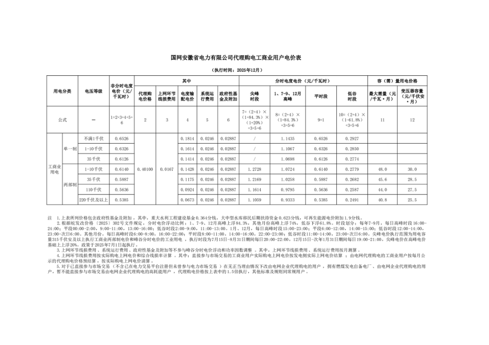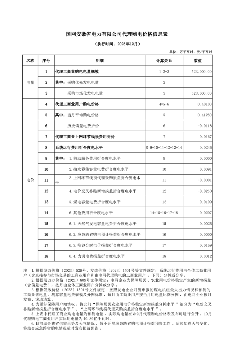 2025年12月国网安徽省电力有限公司代理购电价格信息表