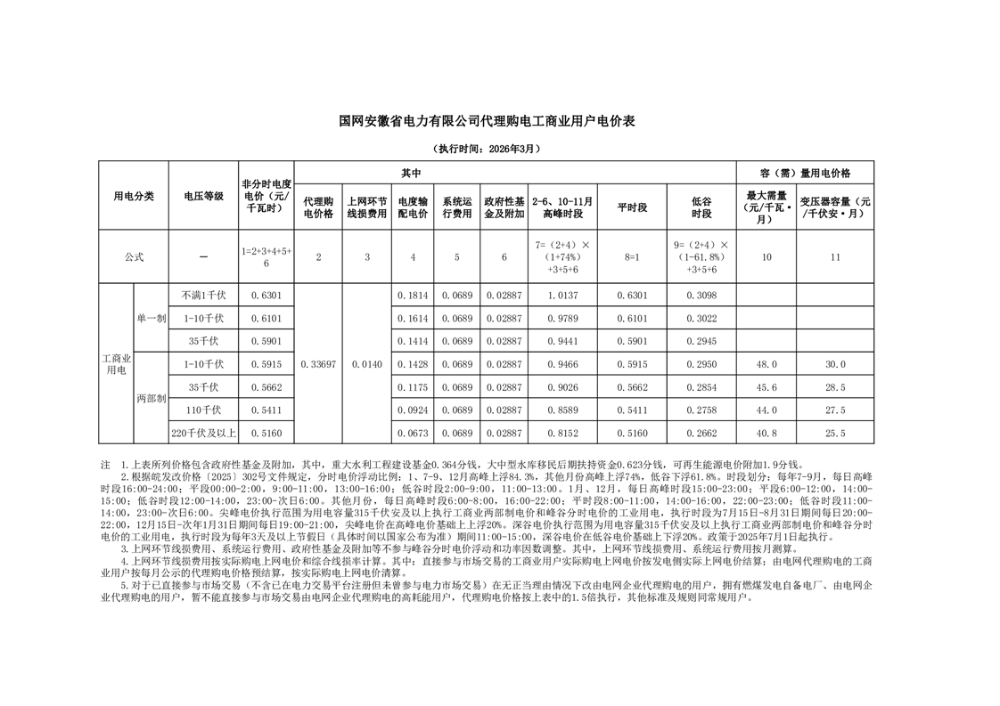 2026年3月国网安徽省电力有限公司代理购电价格信息表