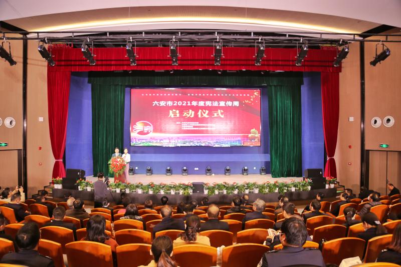 在第八个国家宪法日即将到来之际,12月3日,由市委宣传部、市人大常委会监司工委、市司法局、市法宣办联合举办的2021年全市“宪法宣传周”启动仪式在市图书馆举行。市委常委、宣传部长李敏,市人大常委会副主任曾庆丽,市政协副主席王安义出席活动并为六安市第二届“十大法治人物”颁奖。皋陶杯作品评选主办单位和“宪法八进”牵头单位的负责同志,法治人物和法治文化作品评选的获奖代表,各县区法宣办以及来自各条普法战线的业务骨干等一百余人参加活动。