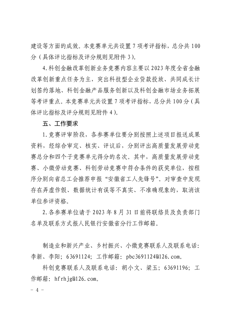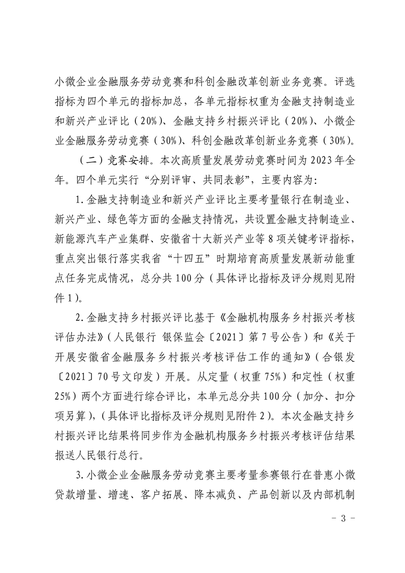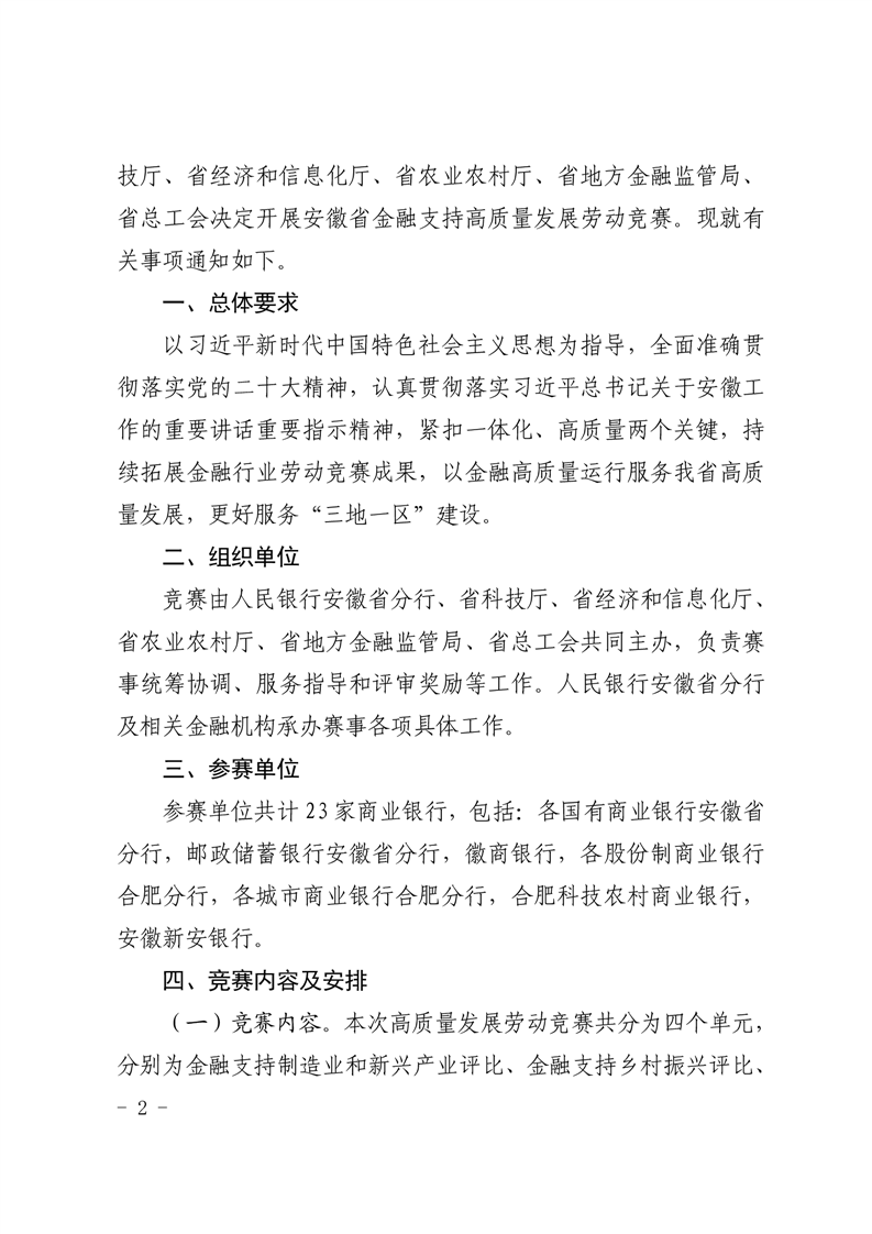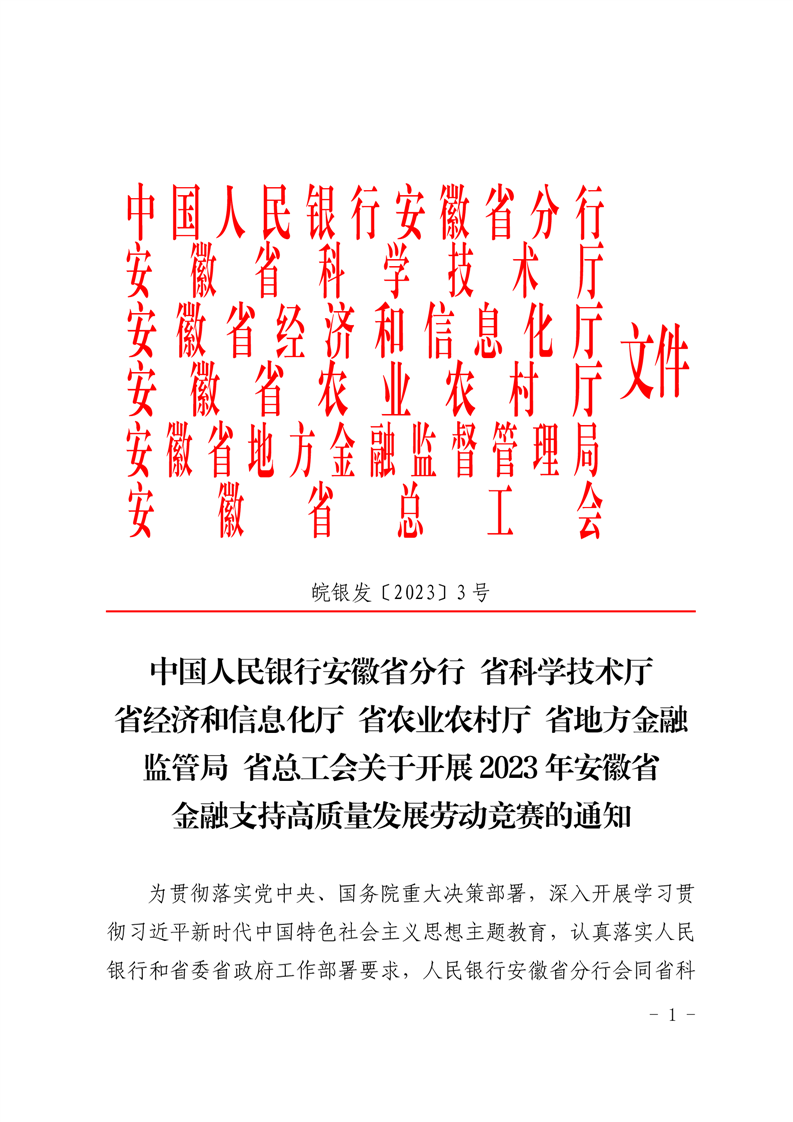 中国人民银行安徽省分行省科学技术厅省经济和信息化厅省农业农村厅省地方金融监管局省总工会关于开展2023年安徽省金融支持高质量发展劳动竞赛的通知