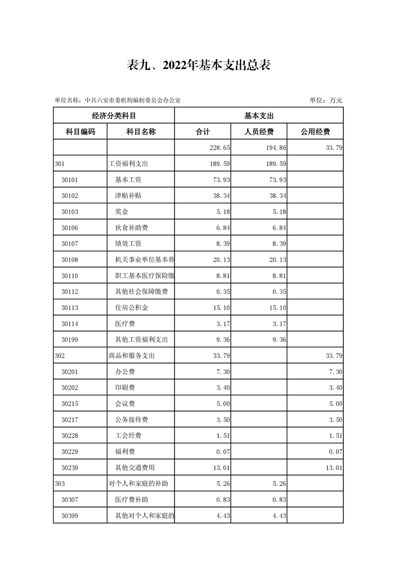 9.中共六安市委编办2022年基本支出总表(附件表9)