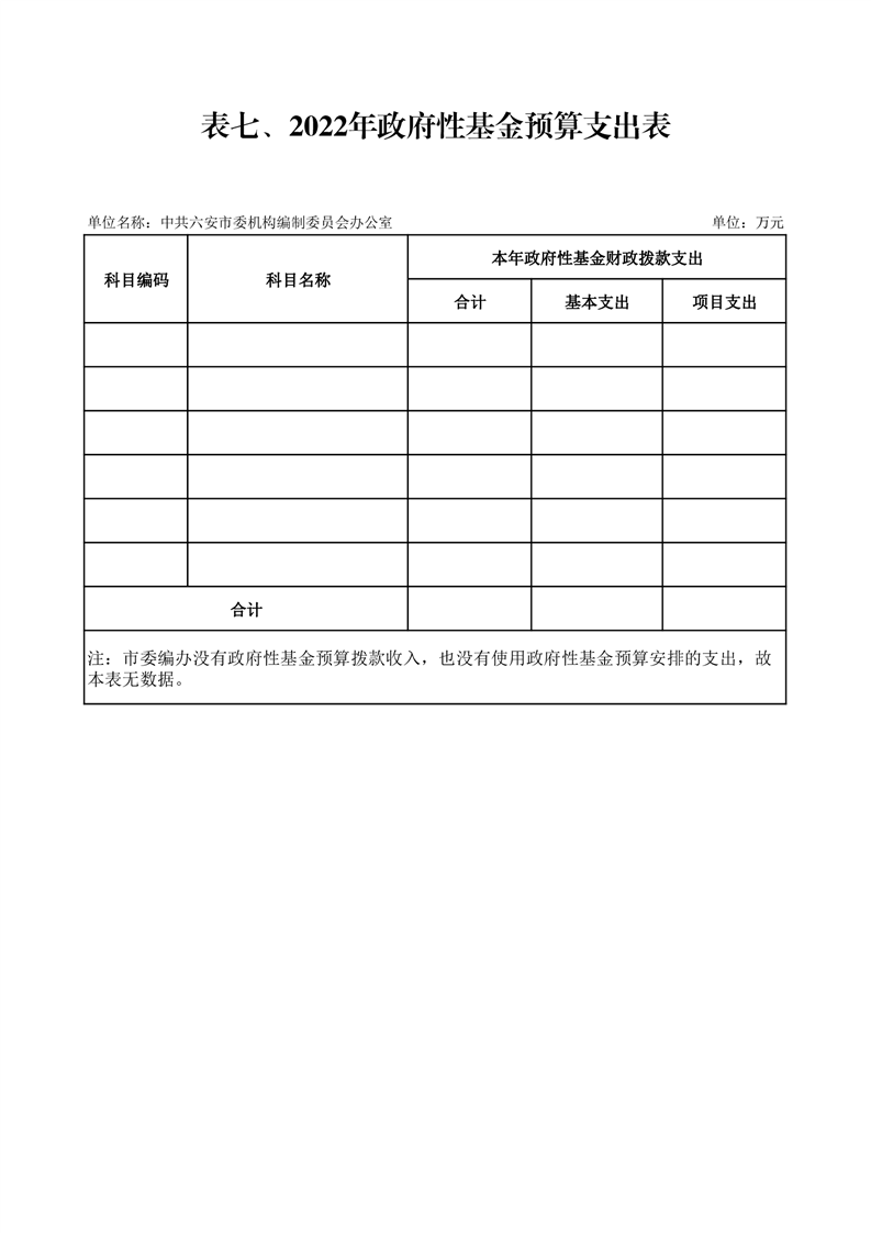 7.中共六安市委编办2022年政府性基金预算支出表(附件表7)