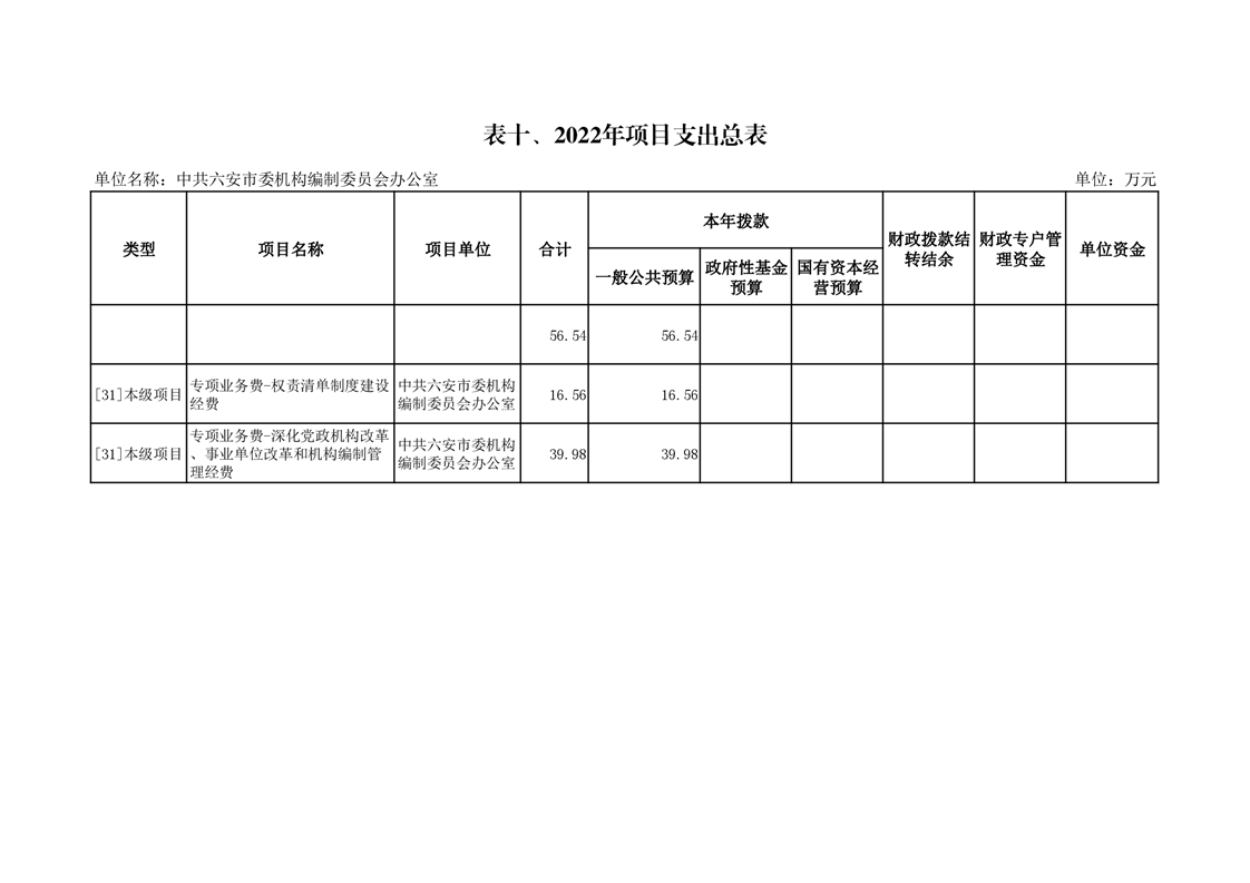 10.中共六安市委编办2022年项目支出总表