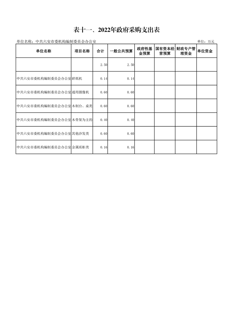 11.中共六安市委编办2022年政府采购支出表