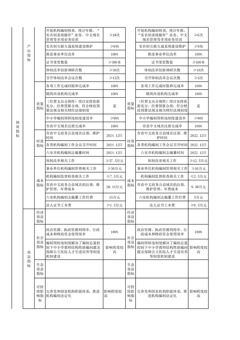 2022年中共六安市委编办编制项目绩效目标2个,预算资金56.54万元。绩效目标包括总体目标和绩效指标,总体目标是项目预期产出和效益的总体描述,绩效指标是总体目标的细化和量化。绩效指标统一按照三级设置,一级指标分为产出指标、效益指标两大类,二级指标分为数量指标、质量指标、时效指标、成本指标(均属于产出指标)和经济效益、社会效益、生态效益、可持续影响指标、满意度指标(均属于效益指标),三级指标结合项目实际,明确具体指标和指标值。
