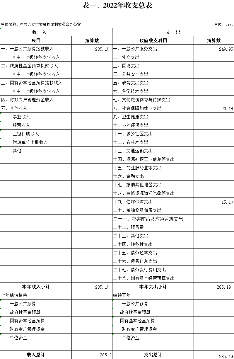 按照综合预算的原则,中共六安市委编办所有收入和支出均纳入部门预算管理。中共六安市委编办2022年收支总预算285.19万元,收入全部为一般公共预算拨款收入,支出包括一般公务服务、社会保障和就业支出、住房保障支出。