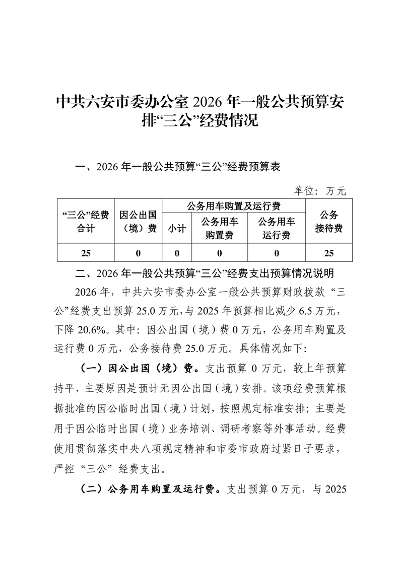 中共六安市委办公室 2026 年一般公共预算安排“三公”经费情况