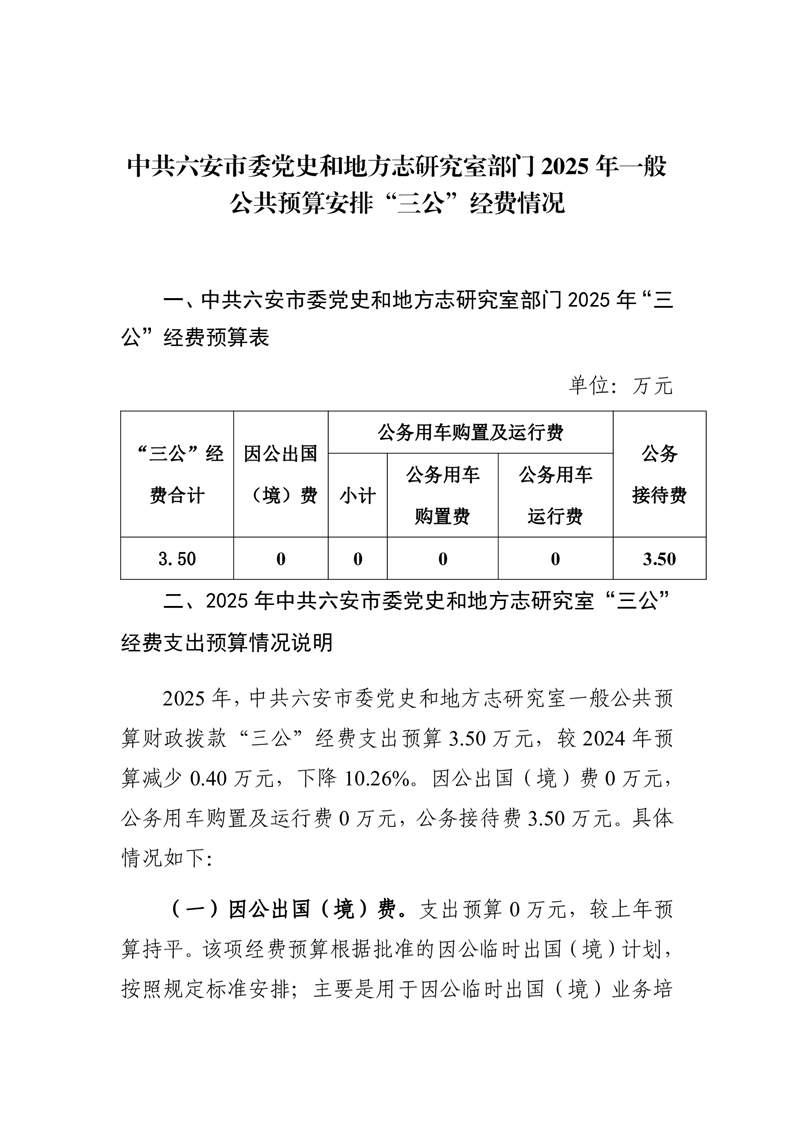 中共六安市委党史和地方志研究室部门2025年一般公共预算安排“三公”经费情况