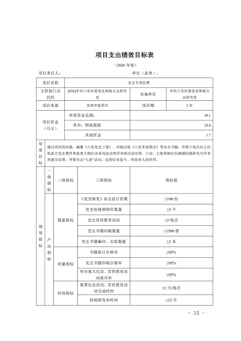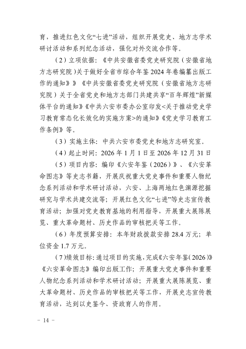 表十四、中共六安市委党史和地方志研究室2026年项目支出绩效目标表.pdf