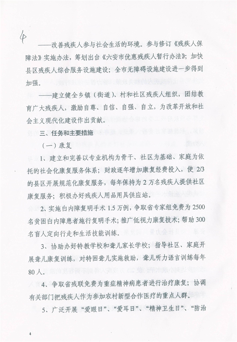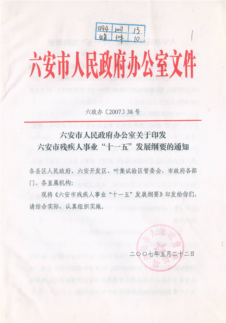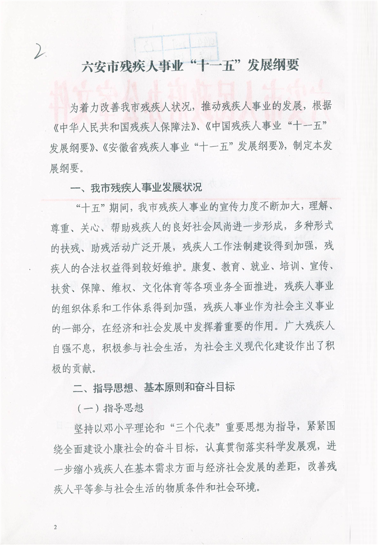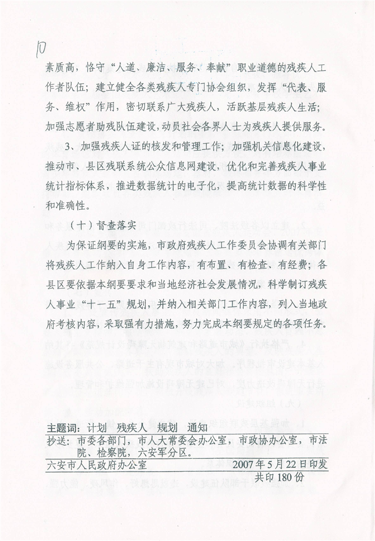 【十一五】六安市人民政府办公室关于印发六安市残疾人事业“十一五”发展纲要的通知(失效)