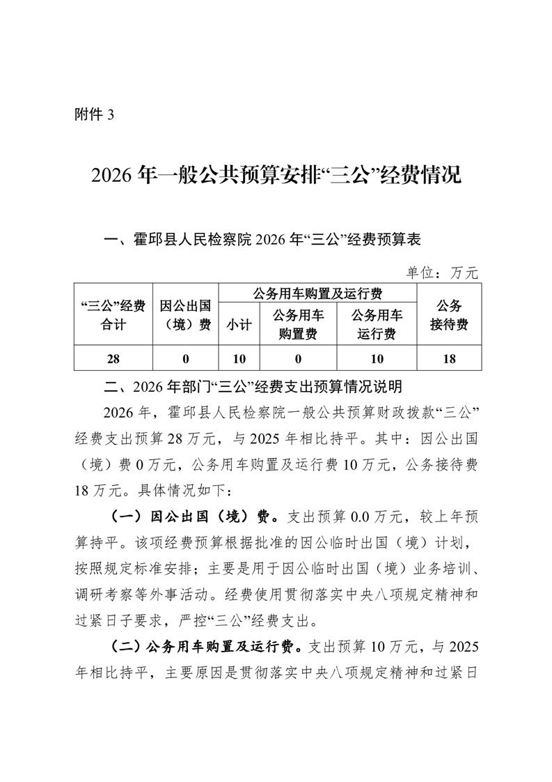 2026年霍邱县人民检察院部门一般公共预算安排“三公”经费情况公开