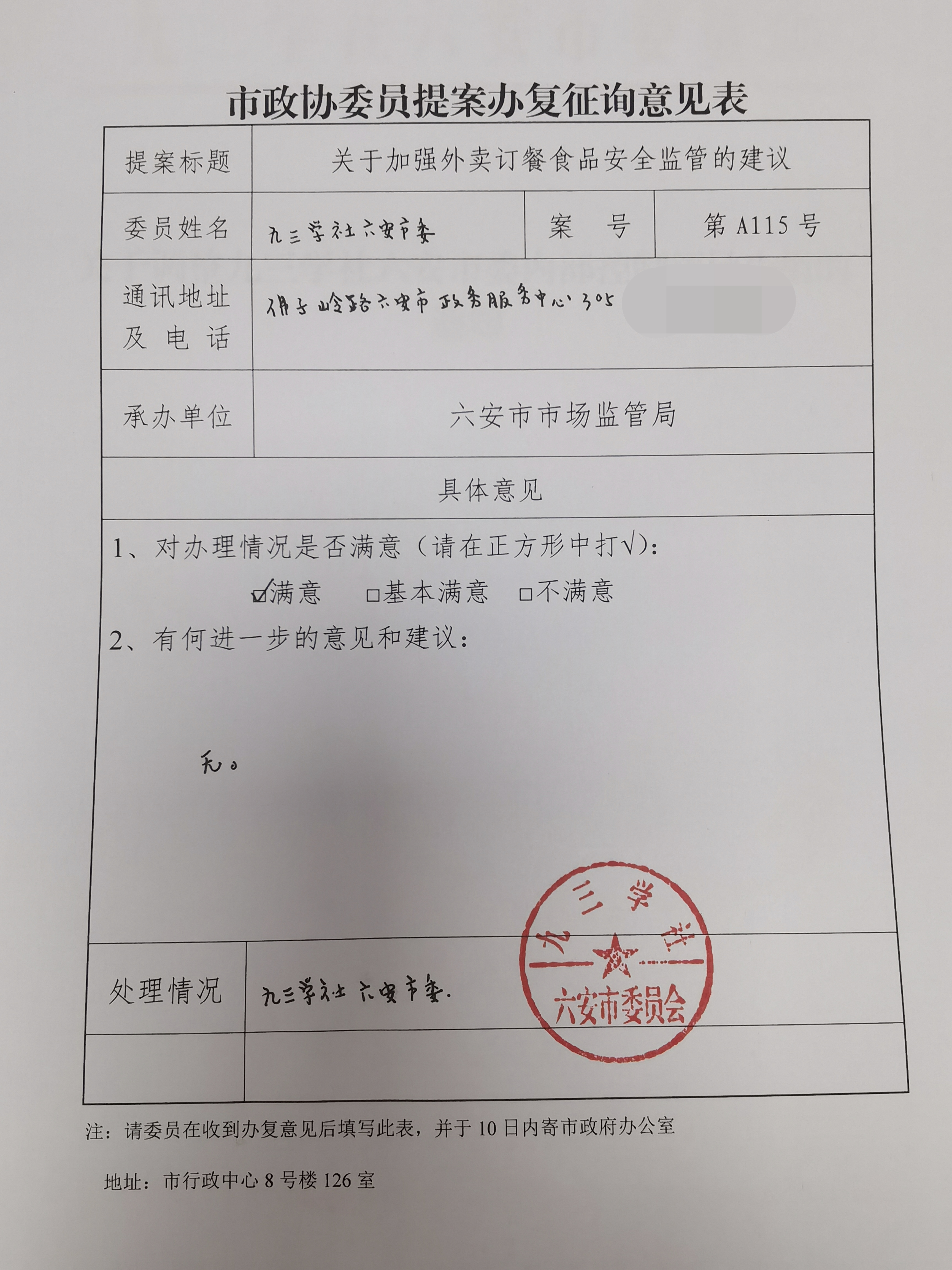 您委提出的《关于加强外卖订餐食品安全监管的建议》收悉。现将办理情况答复如下: