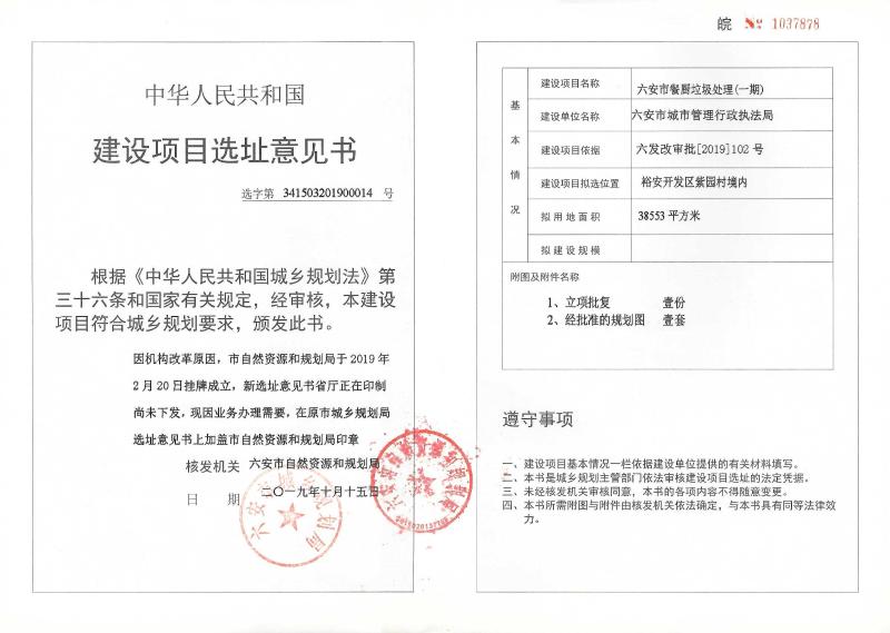 六安市餐厨垃圾处理项目建设项目选址意见书