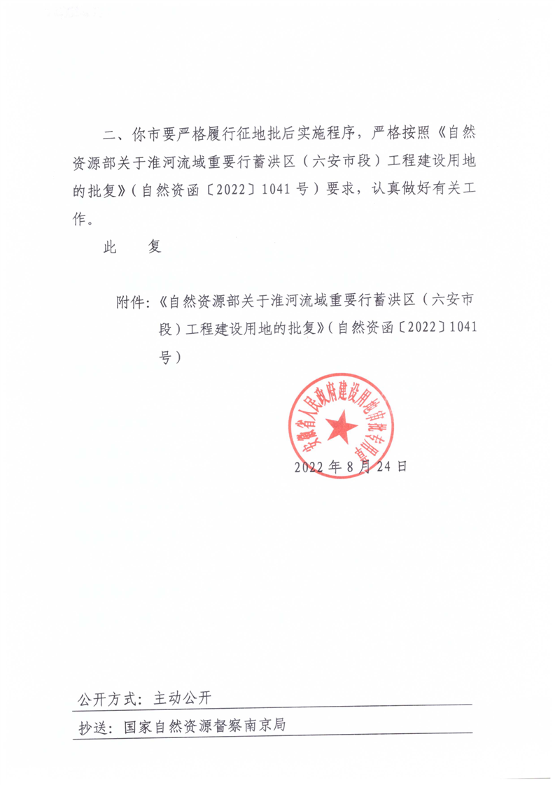 关于淮河流域重要行蓄洪区(六安市段)工程建设用地的批复