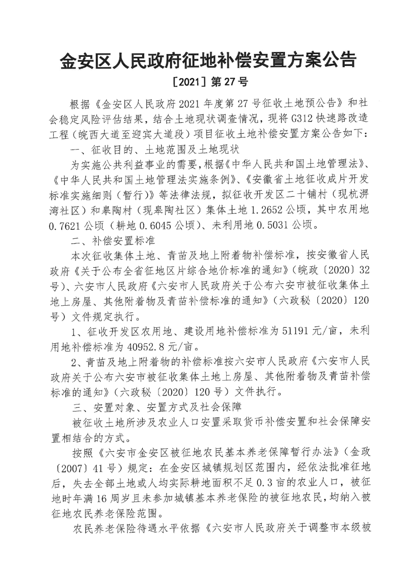 G312快速路改造工程(皖西大道至迎宾大道段)项目征收土地补偿安置公告