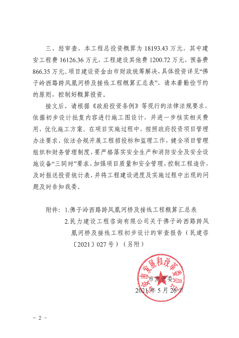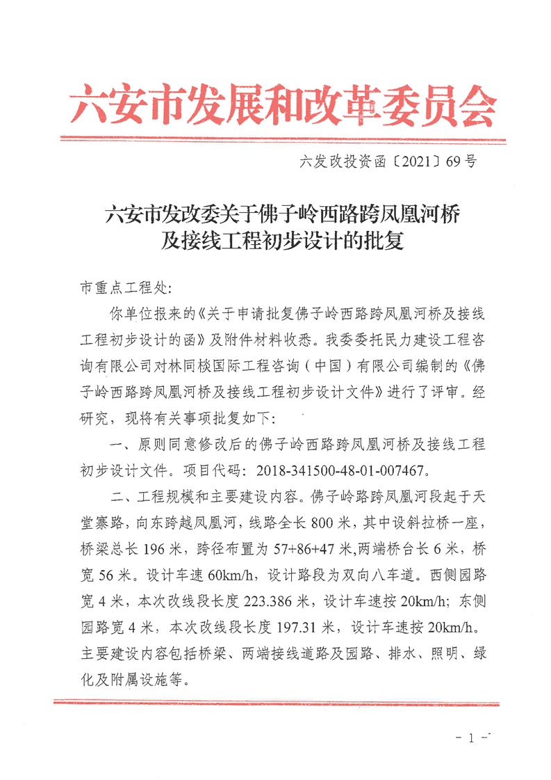 六安市发改委关于佛子岭西路跨凤凰河桥及接线工程初步设计的批复