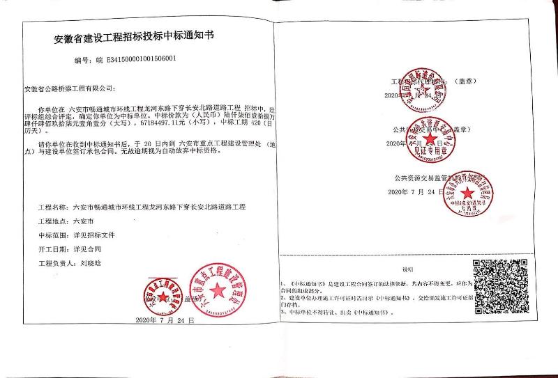六安市畅通城市环线工程龙河东路下穿长安北路道路工程招标投标中标通知书