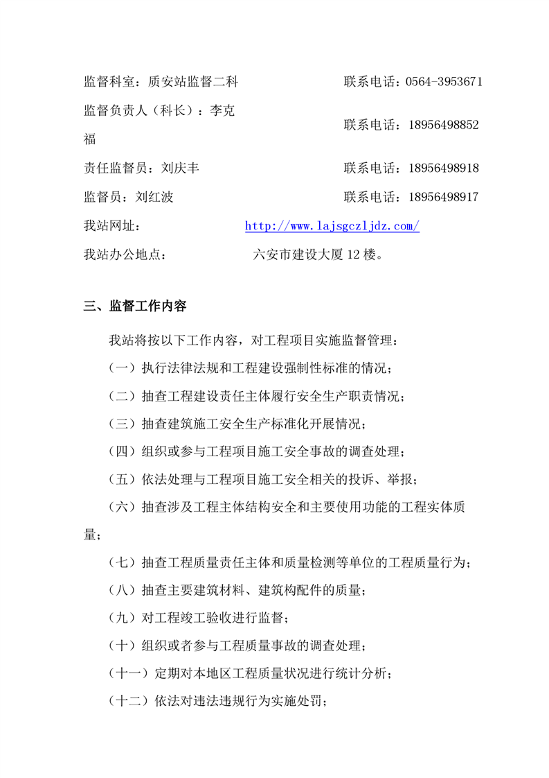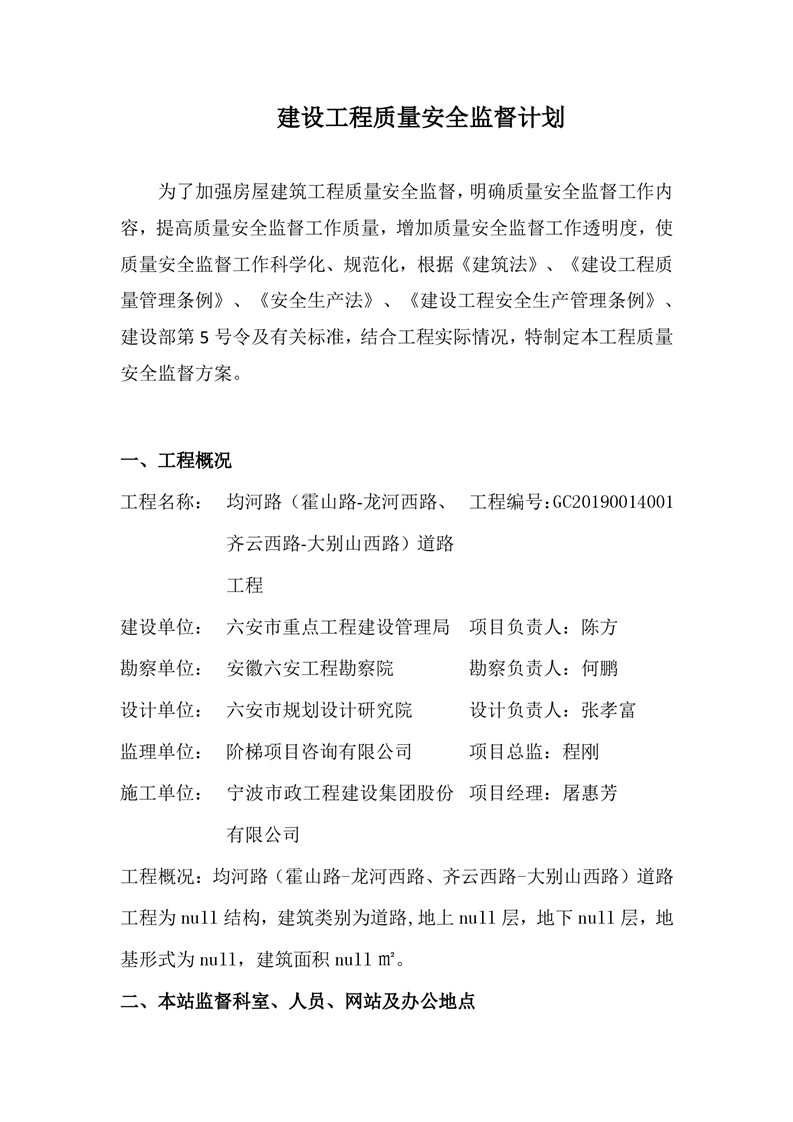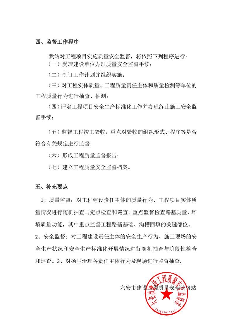 六安市均河路道路工程质量安全监督计划