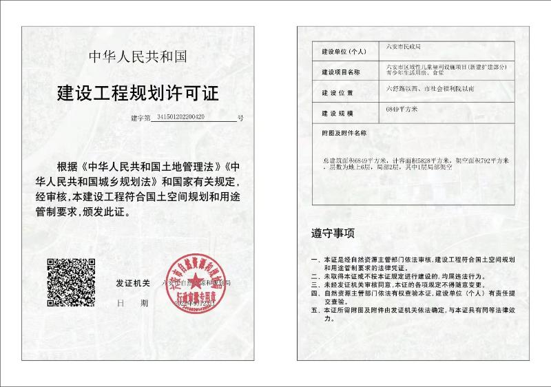 六安市区域性儿童福利设施项目(新建扩建部分)青少年生活用房、食堂建设工程规划许可证