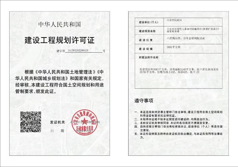 六安市区域性儿童福利设施项目(新建扩建部分)康复教育楼建设工程规划许可证