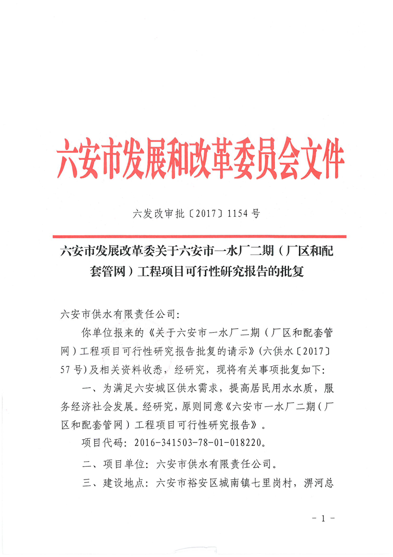 六安市一水厂二期(厂区和配套管网)工程项目可行性研究报告的批复