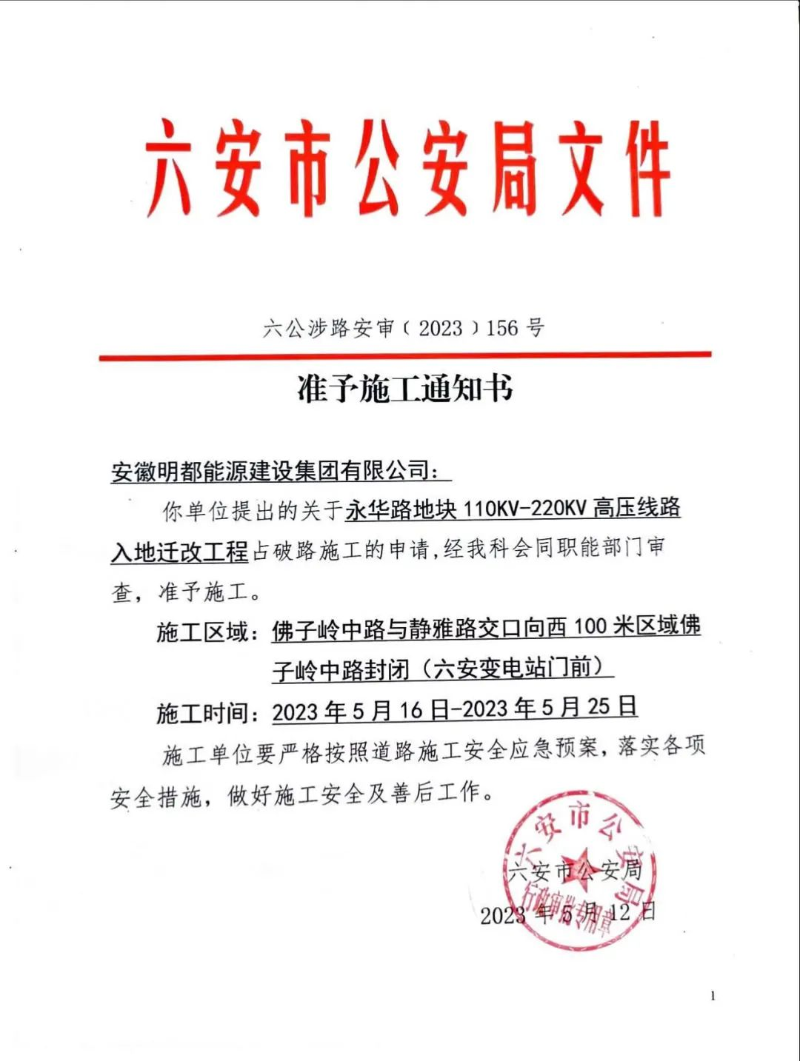 永华路地块110kV—220kV高压线路入地迁改工程项目准予施工通知书