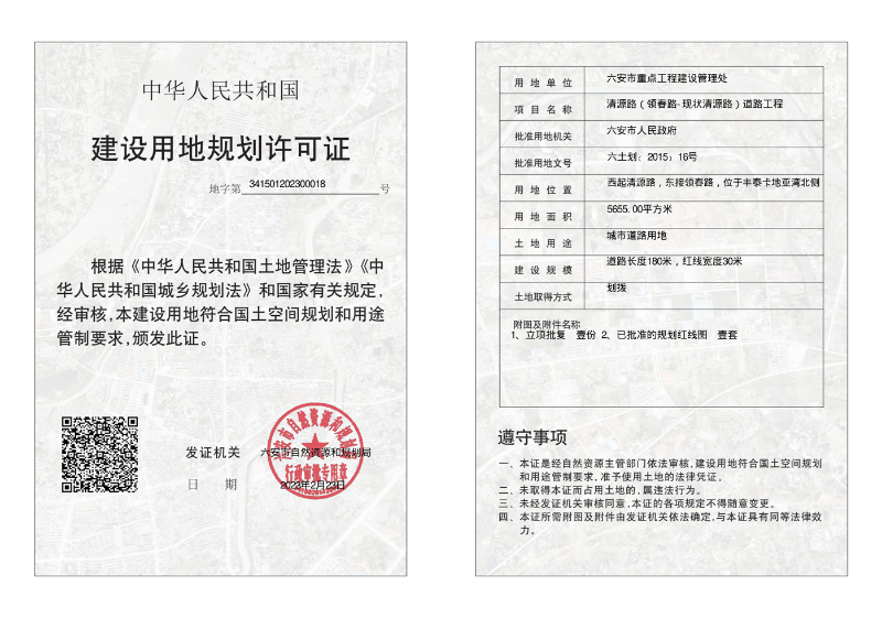 清源路(领春路—现状清源路)道路工程项目建设用地规划许可证