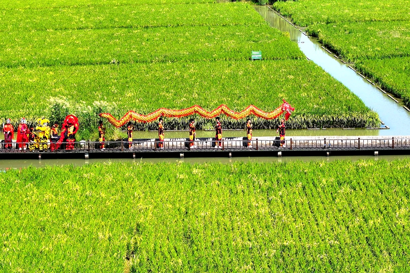 国庆长假期间,裕安区江家店镇林水寨景区以“稻田文化”“民俗表演”“非遗文化”等为主题,开展丰富多彩的乡村旅游文化活动,将传统的民俗文化、非遗文化与景区特色乡土文化深度融合,营造出欢乐喜庆的节日氛围,吸引当地群众和各地游客在沉浸式互动体验中享受多彩假日。 图为10月2日,文化志愿者在田间开展舞龙舞狮等民俗表演。