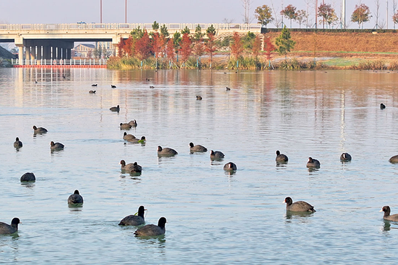 12月17日,在位于金安区城北镇王湾村附近的淠河右岸生态农业示范区一处水面上,近千只白骨顶鸡在这里游弋,时而潜水觅食,时而追逐嬉戏,尽享冬日暖阳。