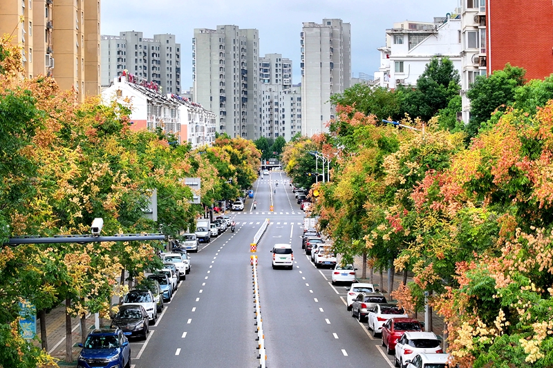 9月17日,六安城区金安路两侧的栾树花竞相绽放,绿叶、黄花与红果缀满枝头,与城市风貌共同构成一道绚丽的秋日风景线。