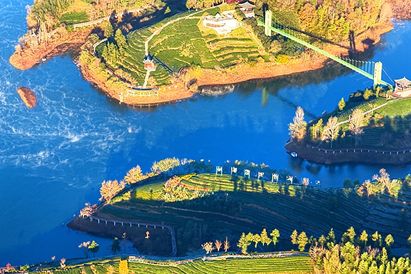 近日,金寨县油坊店乡西茶谷主题公园晨雾缭绕,茶园、山林与响洪甸水库相映成景,宛若水墨画卷。