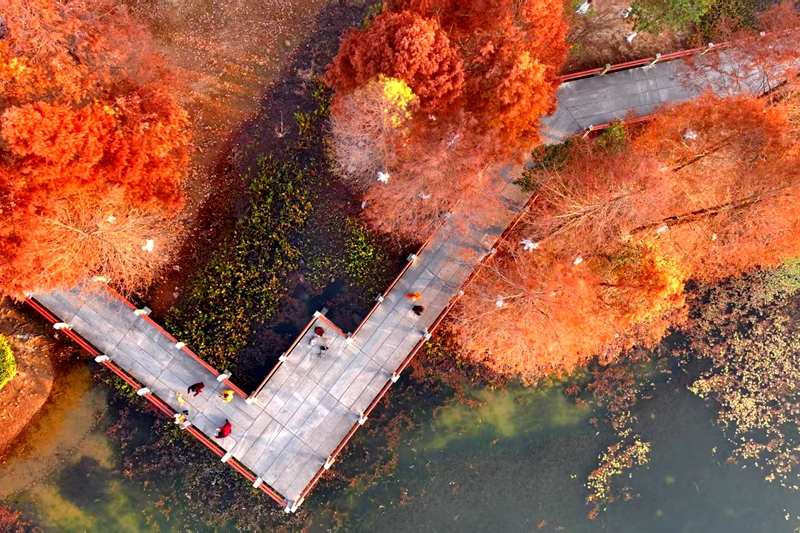 12月9日傍晚,金安区南湖湿地公园,披上“红妆”的水杉树在冬日斜阳的映照下色彩斑斓,宛如一幅浓墨重彩的油画。它们与景观桥、亲水平台相映成景,美不胜收,为九十里山水画廊增添了一道别样风景,吸引了众多市民和游人前来观光游玩,乐享冬日的美好时光。