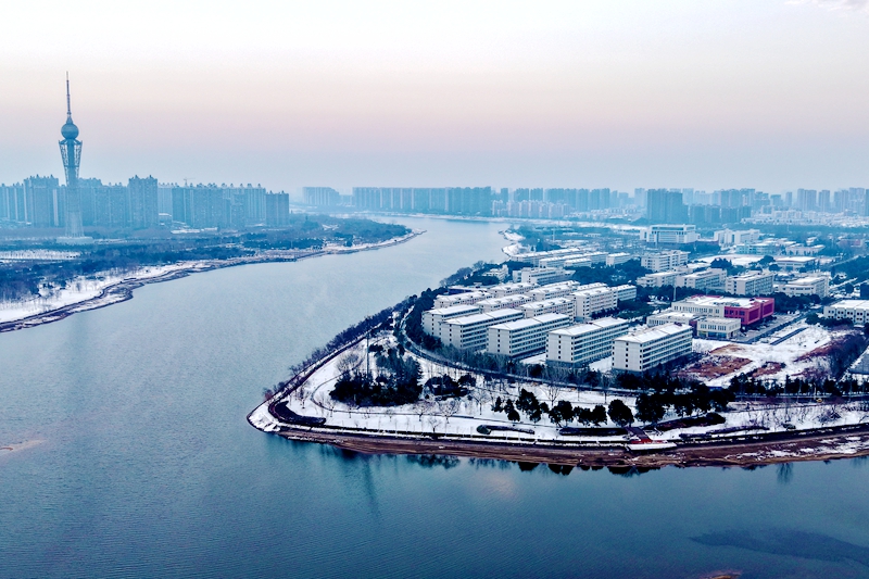 1月21日,雪后初霁的六安淠河国家湿地公园绿水荡漾,两岸银装素裹,宛若丹青。