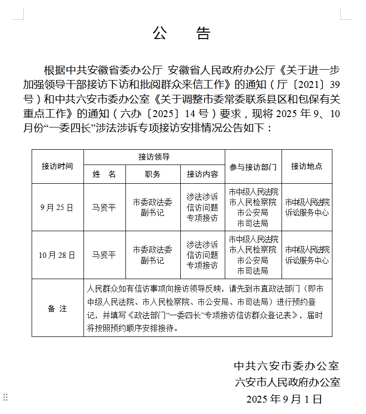 2025年9、10月份“一委四长”涉法涉诉专项接访安排情况公告