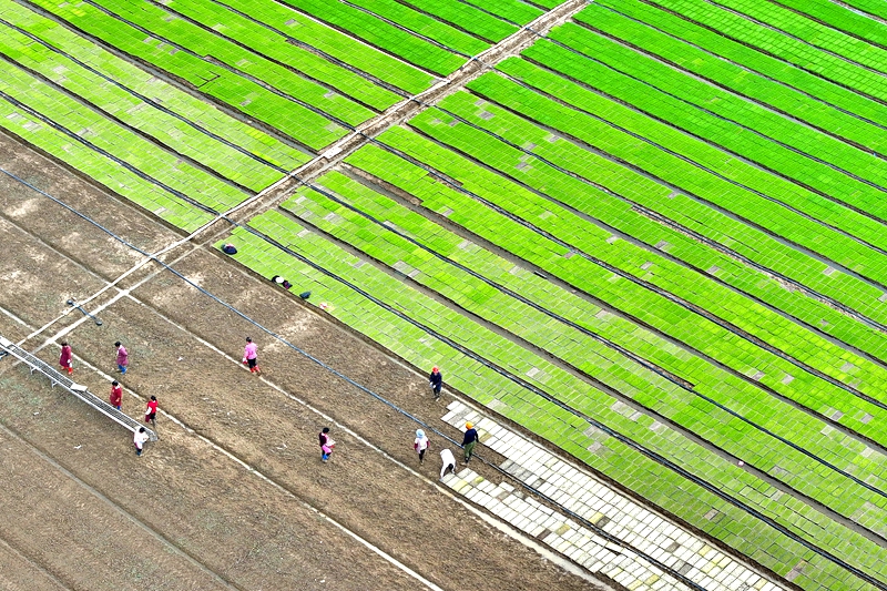 6月2日,裕安区苏埠镇戚桥村,农民在田间铺设秧盘育秧,忙碌的身影构成乡村夏耕夏种时节最美的音符。