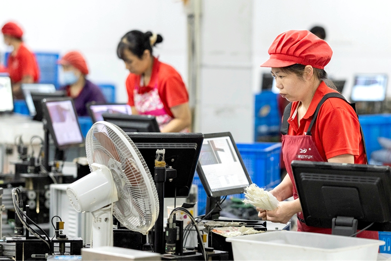 10月11日,在裕安区新安镇的宇翔体育用品有限公司生产车间内,工人们正在生产线上紧张忙碌着。