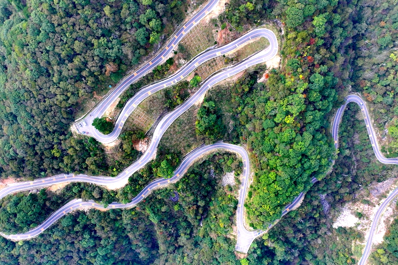 图为金寨县马鬃岭马丁公路上,行驶的汽车、蜿蜒曲折的盘山公路与崇山峻岭相映成景,宛如画卷。