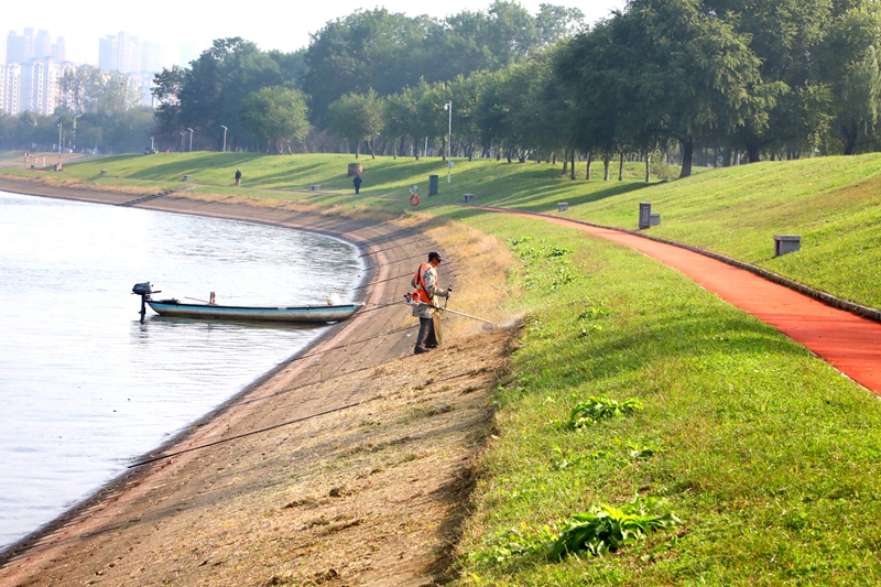 随着秋冬季的来临,为维护城区河道生态环境,保障堤防安全,近日,六安市城区新老淠河综合管理处紧抓有利时机,组织工人对月亮岛周边水域的护坡开展集中除草养护作业。