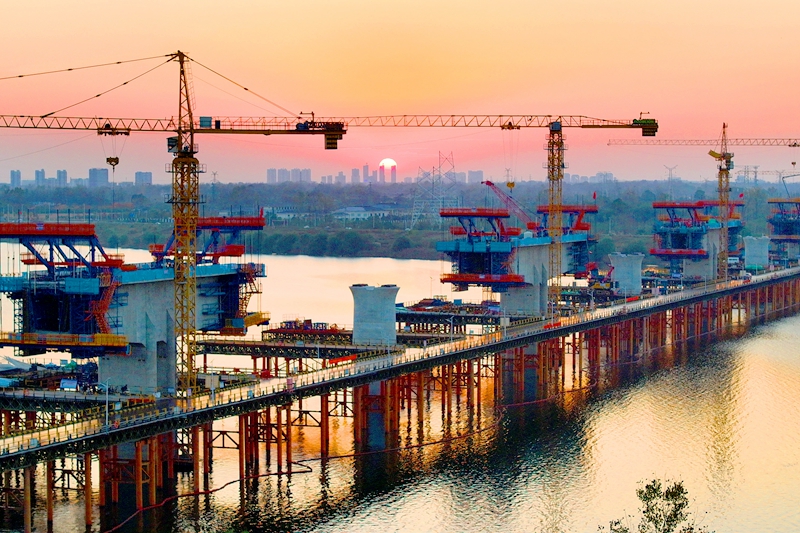 11月11日傍晚,金安区城北镇境内,合武高铁六安淠河特大桥(金裕淠河特大桥)紧张的施工现场与天边绚丽的晚霞交相辉映,构成一幅壮美的初冬施工画卷。