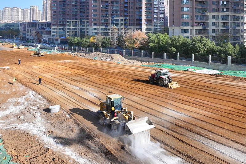 11月28日,六安城区长安北路(天河西路至解放北路交口段)改造工程项目现场,几台大型工程车辆正在对路基进行平整、压实等作业。