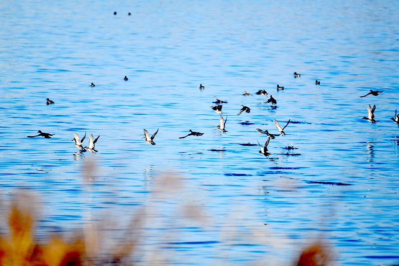 12月14日,一群野鸭在淠河国家湿地公园水面上飞舞觅食。