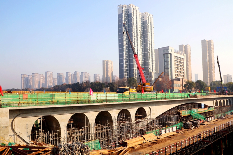 12月25日,六安城区五里墩大桥拆除重建项目施工现场,新建的南侧和北侧边幅桥部分施工脚手架和围挡拆除,边幅桥主体、桥孔等初现“芳容”。
