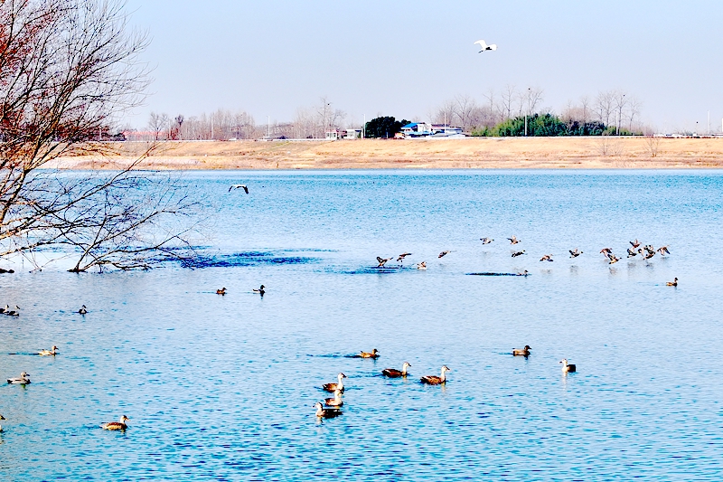 1月11日,白鹭、野鸭等水鸟在淠河国家湿地公园金安区城北镇段飞舞、觅食、游弋,给冬日的淠河湿地公园增添了些许趣味和灵动。